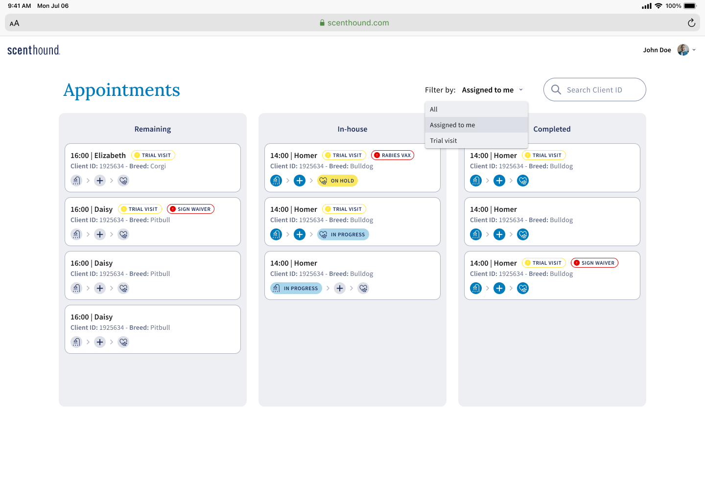 The Scenter web app is designed to increase accuracy, efficiency, and speed. Technicians work with multiple dogs daily and the Scenter app can provide a more streamlined process for tracking health and hygiene information.